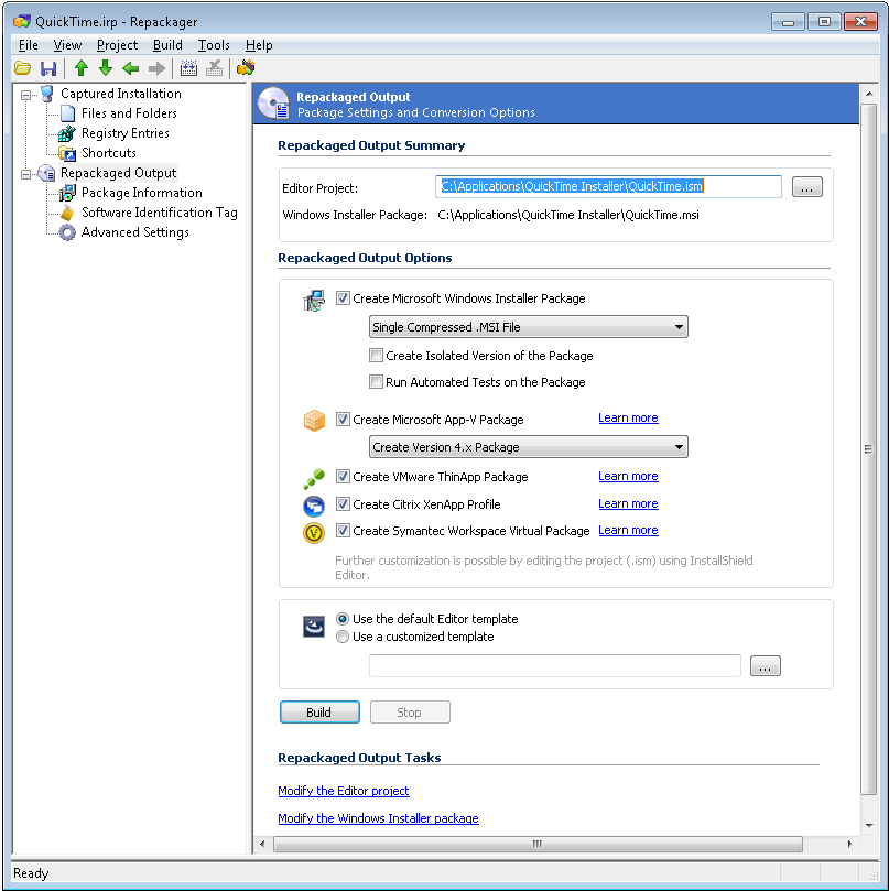 | Repackaged Output Tasks | After an InstallShield Editor project and a Windows Installer package has been built, you can use these links to perform the following tasks: Modify the Editor project—Open this Repackager project’s associated InstallShield Editor project in InstallShield Editor. Modify the Windows Installer package—Open this Repackager project’s associated Windows Installer package in InstallShield Editor. |