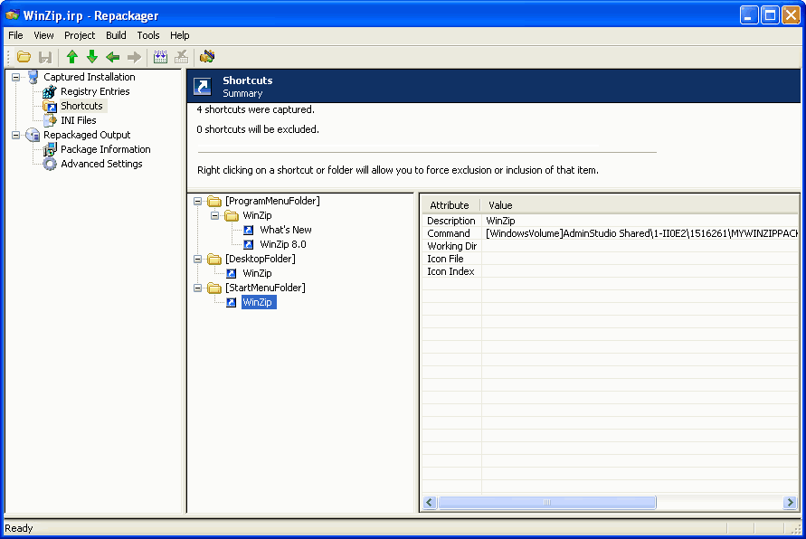 The upper pane displays the number of shortcuts captured and how many of these shortcuts will be excluded from the Windows Installer package when built. The lower-left pane provides a tree from which you can see where shortcuts will be installed and the names of the shortcuts. When you select a shortcut from the tree, the lower-right pane displays attributes for that shortcut. These attributes are: