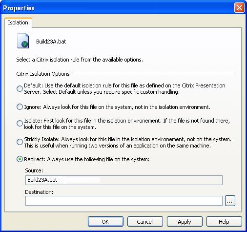 On the File Isolation Options dialog box, you can override the default Citrix isolation option for the selected file.