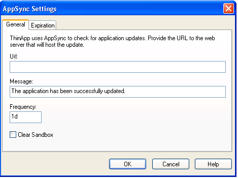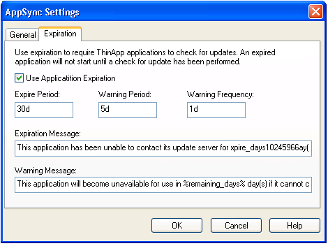 On the Expiration tab, you can specify that the ThinApp application is required to check for updates at a defined frequency. If the ThinApp application fails to successfully check for updates within that defined frequency, it will fail to run. Note that the update does not expire, the ThinApp application expires, and cannot be used until it is updated. successfully.