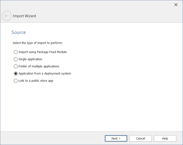 - In the Source panel, select Packages from a deployment system / Application from deployment system and click Next . The Source Server Details panel opens.