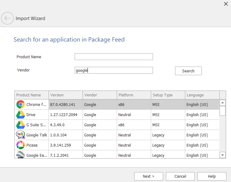 - Click Next . When using the Package Feed Module, dynamic custom panels will appear in the Import Wizard based on the settings defined for each package. For example, when importing the Google Chrome package, several dynamic custom panel will appear, including the Options panel.