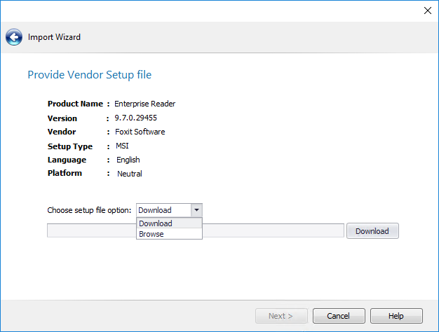 - When you have finished downloading the setup file to the package feed configured download path, click Next . The Silent Command Line Arguments panel loads.