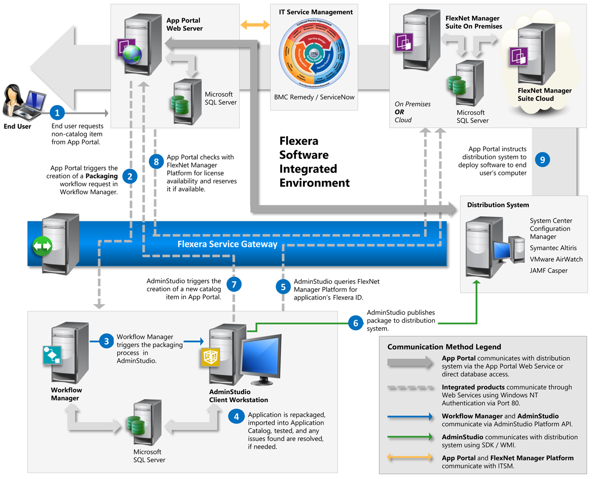 Because AdminStudio can communicate with App Portal, FlexNet Manager Suite, and Workflow Manager via the Flexera Service Gateway, you can implement a unified application management workflow.