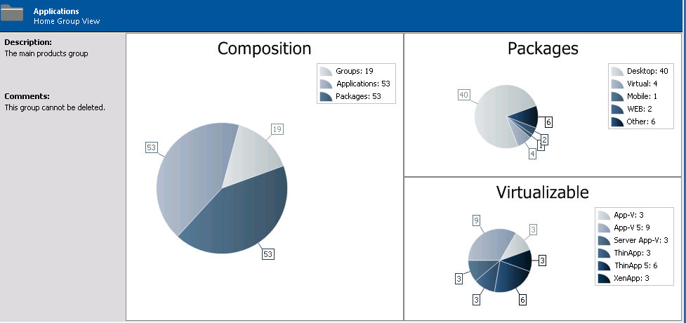 - Packages—Displays the number of packages in each of the following categories: installers (Windows Installer packages and legacy installers), virtual packages, mobile apps, and other.