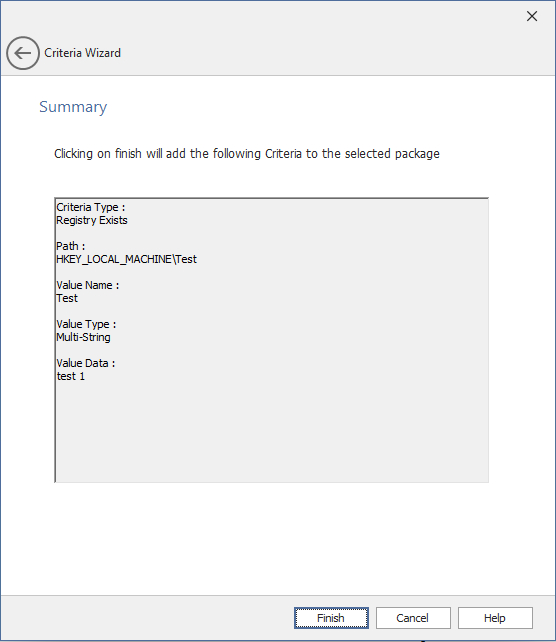 On the Summary panel, a summary of your selections is listed. Click Finish to add the criteria to the list.