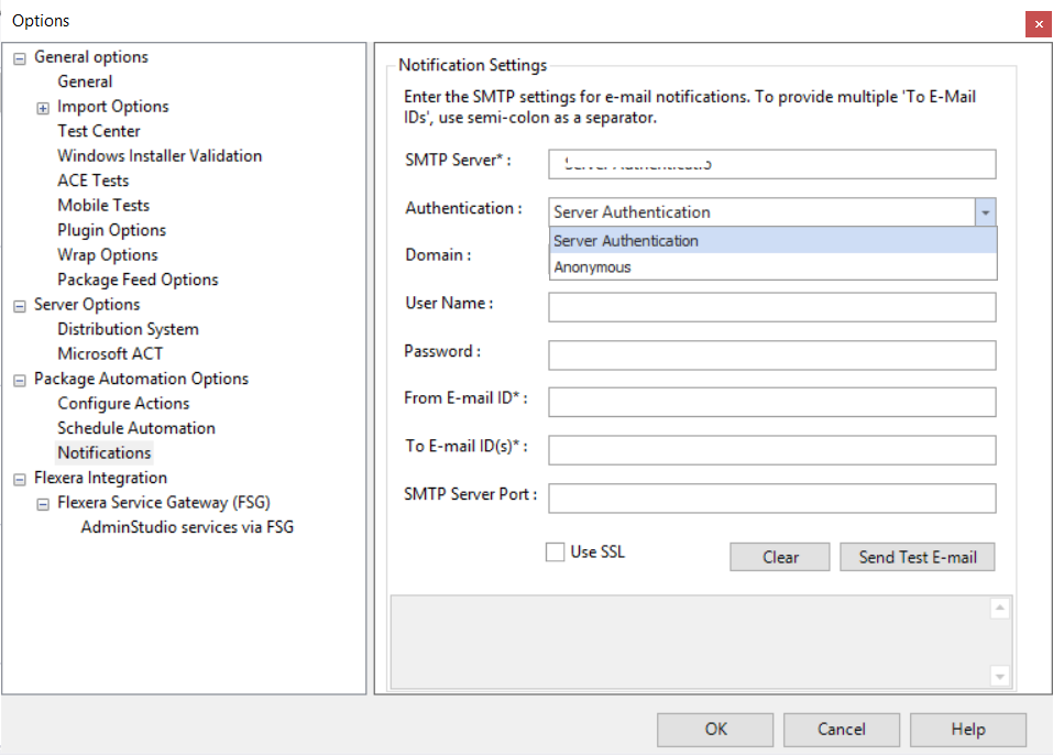 - Click the Authentication drop down and set to either Server Authentication or Anonymous .