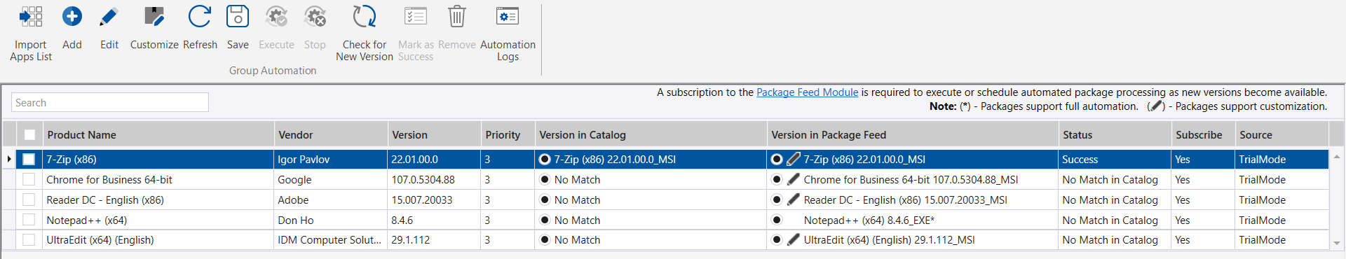 All the Package Feed Module trial packages are by default subscribed for automation by setting the Subscribe column to Yes . If you wish to change, set the Subscribe column to No .