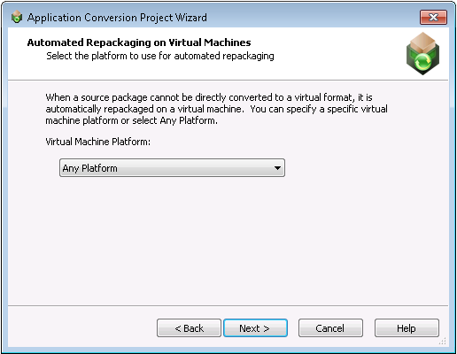 Click Next . The Automated Repackaging on Virtual Machines panel opens, prompting you to select the platform of the virtual machines that you want to use to perform automated repackaging during this conversion process.