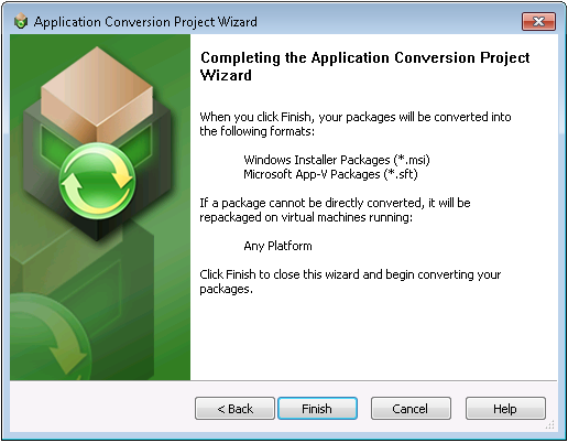From the Virtual Machine Platform list, select a platform, or leave Any Platform selected, and click Next . The Application Conversion Project Wizard Complete panel opens.