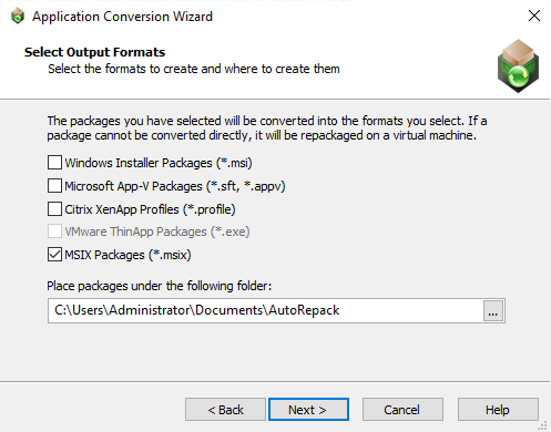 If you have selected Windows Installer packages on the Selected Package List panel, but those packages do not require repackaging prior to virtualization, the Windows Installer Package (*.msi) option on the Select Output Formats panel will be disabled. If you want to force the Automated Application Converter to repackage that package, return to the Selected Package List , click in that package’s Virtualization Readiness column and select Requires repackaging from the list.