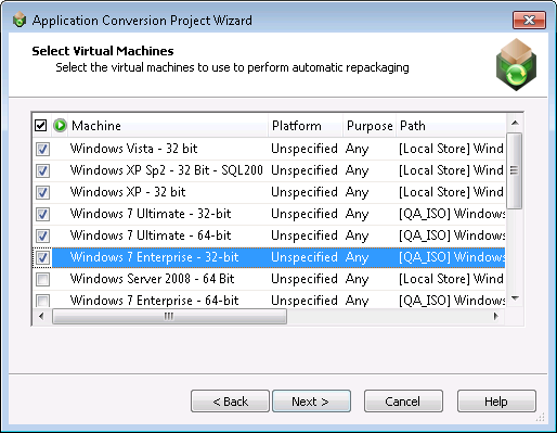 - Optionally, if you want to limit the use of a virtual machine to either repackaging only or testing only, click in the Purpose column and select Repackaging or Testing from the list. The default value is Any .