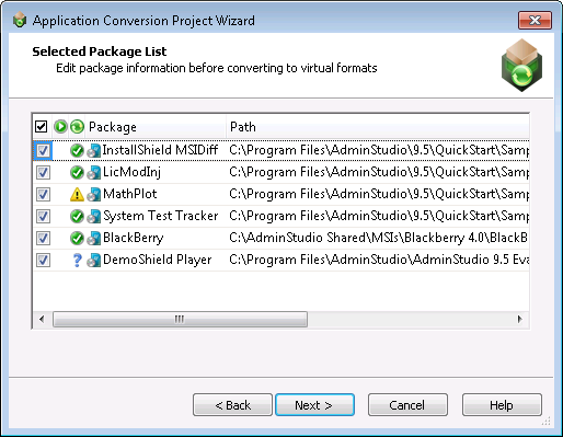 - When you have finished this step, packages will be listed and selected on the Selected Package List panel, and an icon indicates each package’s virtualization readiness status.