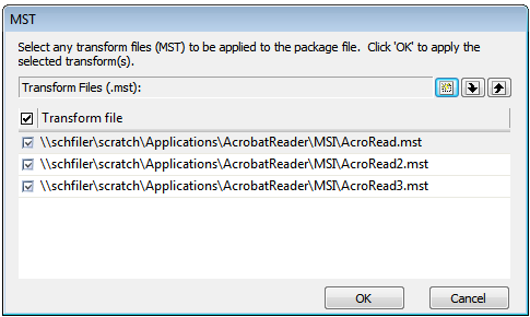 .mst) files that you want to import along with the Windows Installer package. If you do not want to import a selected.mstfile, clear the selection.