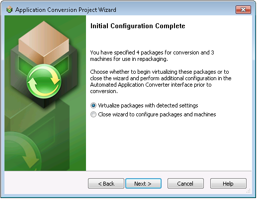 - Virtualize packages with detected settings—Select this option if you want to begin conversion of the selected packages using the selected virtual machines using the current settings.