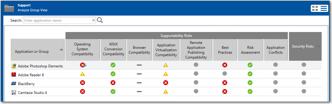 - When issue resolution and reimporting is complete, look at the Analyze Group View , Application View , or Deployment Type View of the package, application, or group that you tested. You will see that the Error With Fix and Warning With Fix icons have been replaced with the status icon with the next highest level (as described in Hierarchical Level of Status Icons) in that test category.