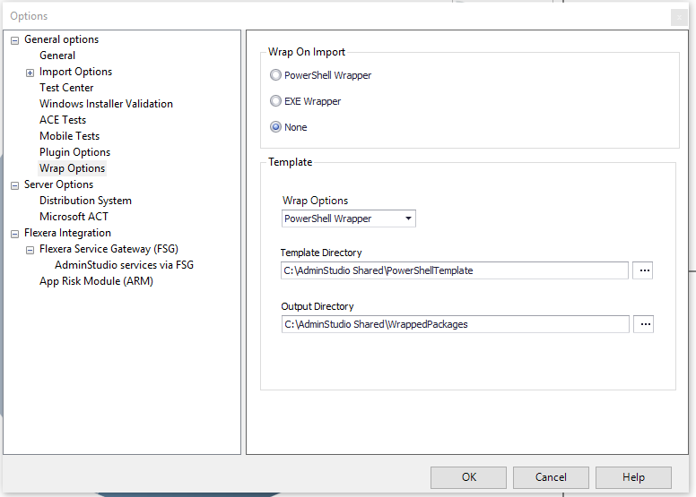 On a new tab of the Application Catalog Options dialog box, Wrap Options , you can set an option automatically to wrap a package during import from the template, you can specify the location of the template directory and the output directory for PowerShell Wrapping and EXE Wrapping by selecting the option from the “Wrap Options” drop down menu.