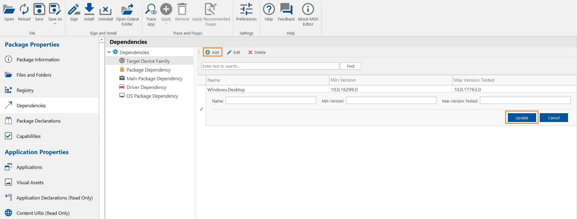 To add dependencies to the selected MSIX Package, perform the following steps