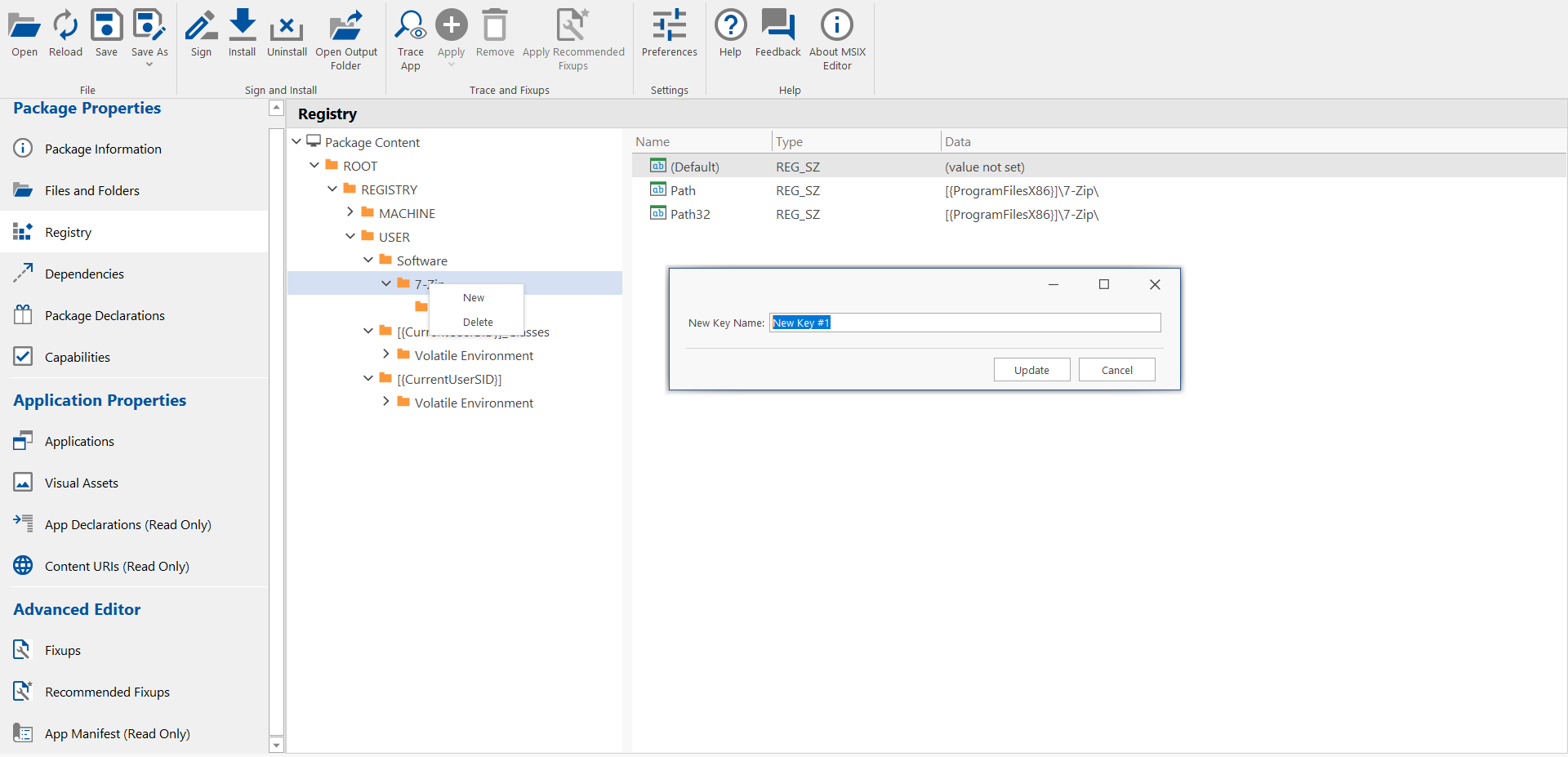 - Upon saving, the new registry key will be added to the selected MSIX package.