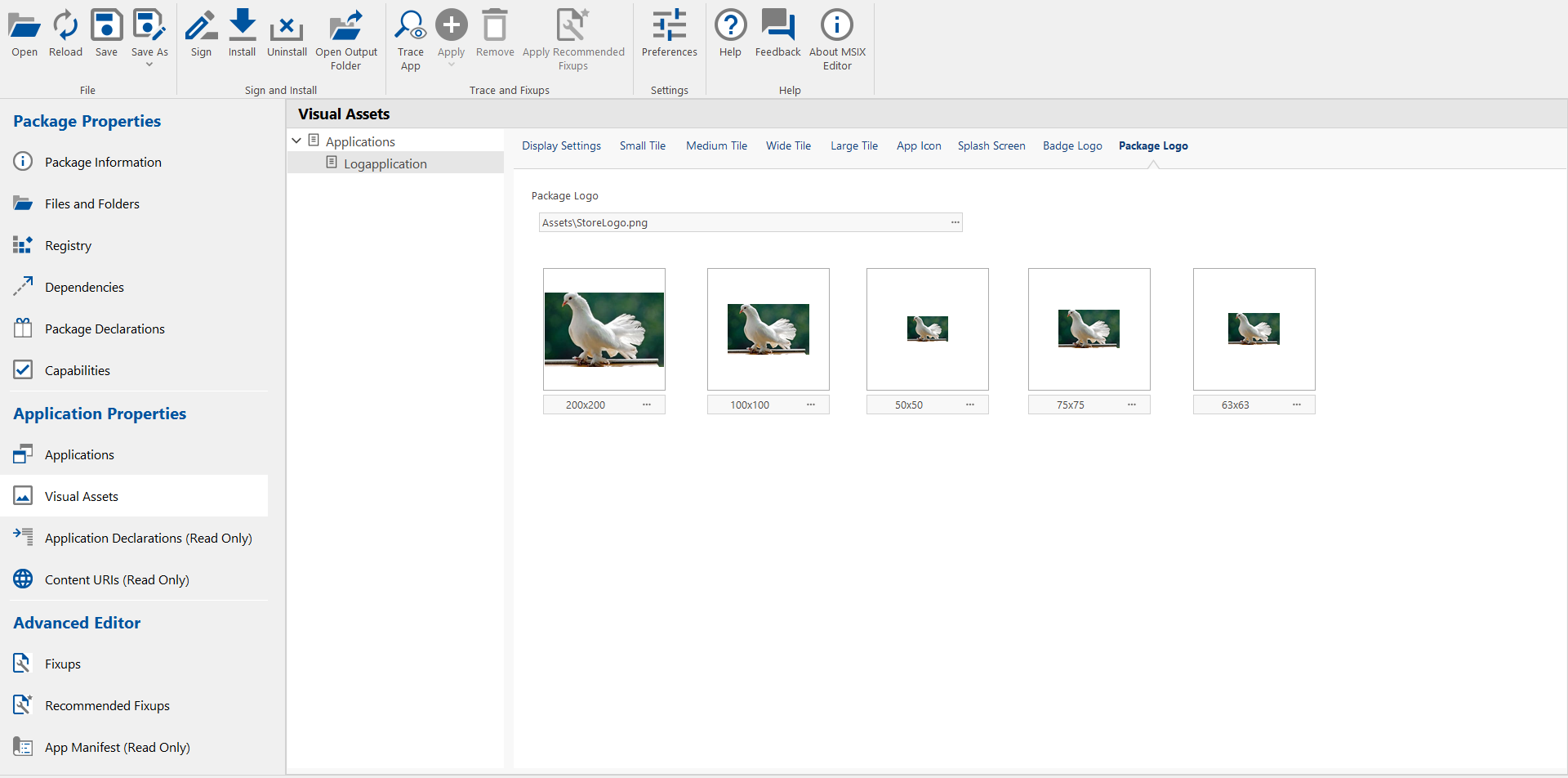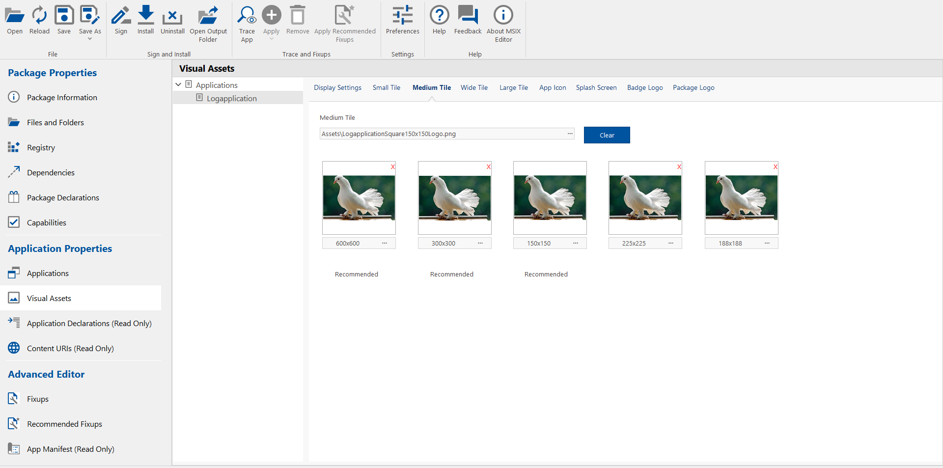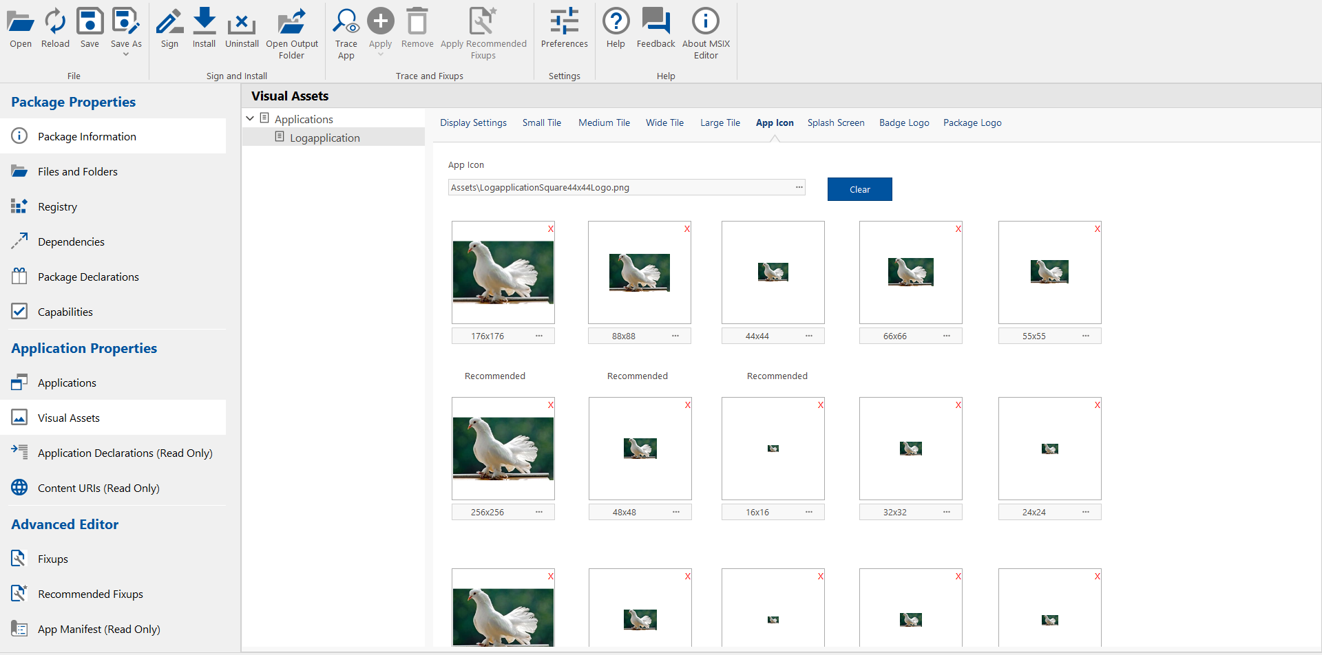 Visual Assets comprise of different tile sizes, application icon, package logo, splash screen and badge logo. Upon its installation, MISX surfaces on a Windows machine through these visual assets, for example as tiles and/or application icon on the start menu. Unlike traditional MSI icons, Visual Assets provide flexibility to specify different sizes of tiles and icons with different images and scales. The Visual Assets view enables you to view, edit and generate new visual assets for an MSIX package.